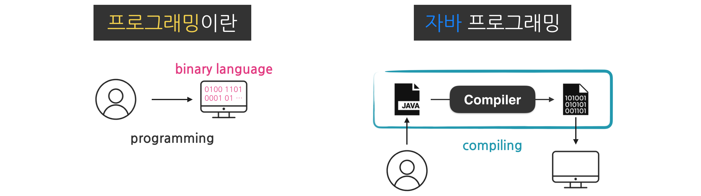 자바는 이러한 문제를 해결하는 도구이다. 자바는 사람의 명령을 컴퓨터의 언어로 바꿔준다. 이렇게 자바 언어로 컴퓨터에게 일을 시키는 것. 이를 자바 프로그래밍이라 한다.