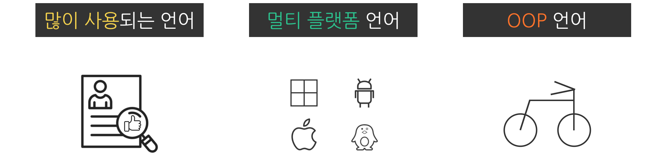 - 자바의 특징은 아래와 같다.