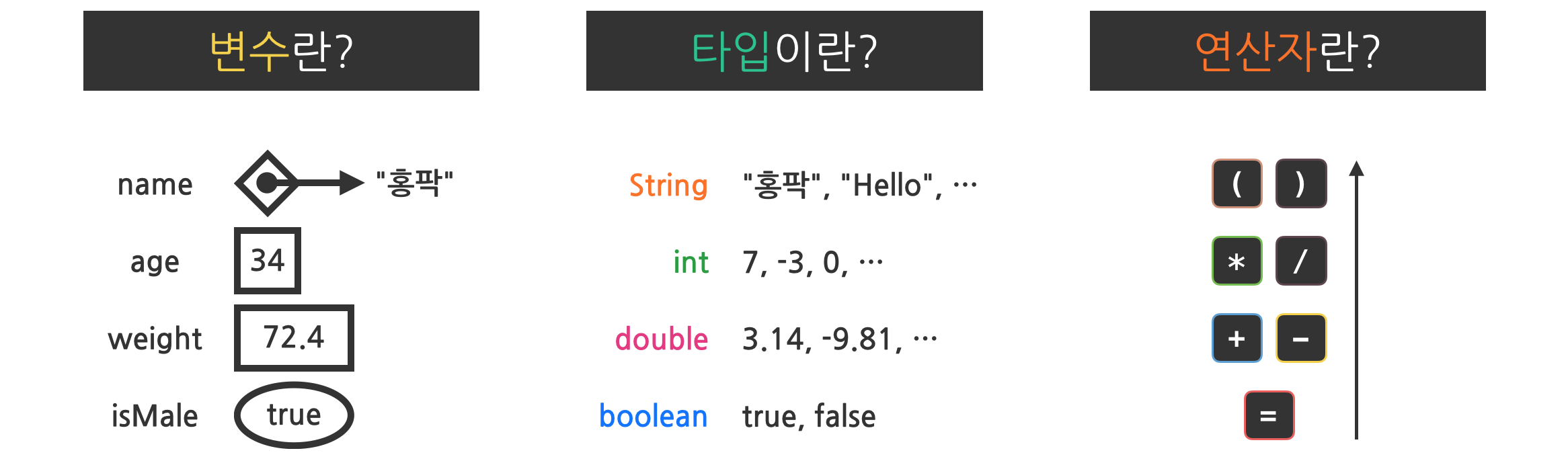 - 대표적 타입으로는 int(정수), double(실수), String(문자열), boolean(논리형)이 있다.