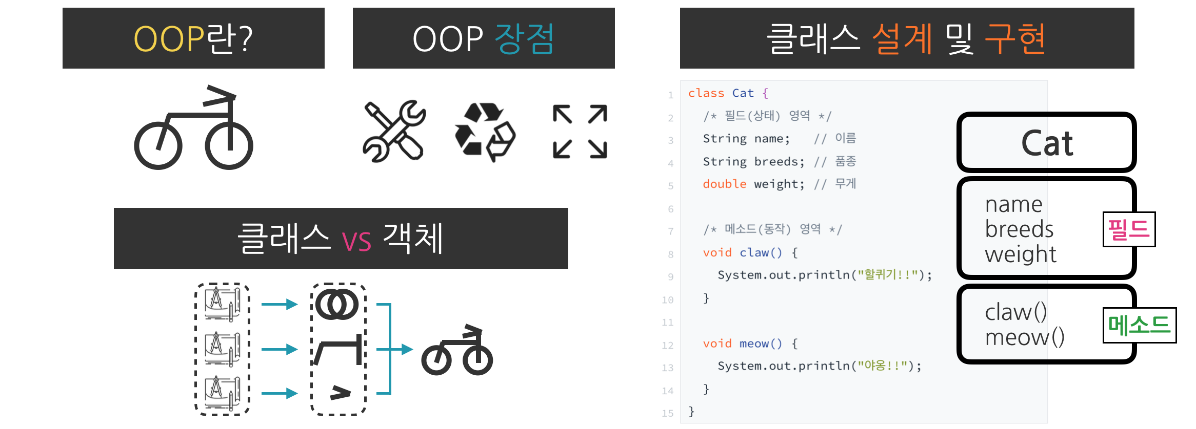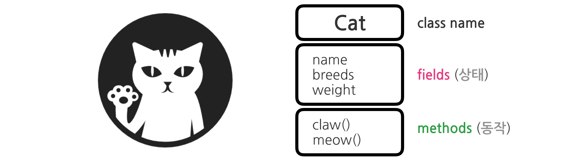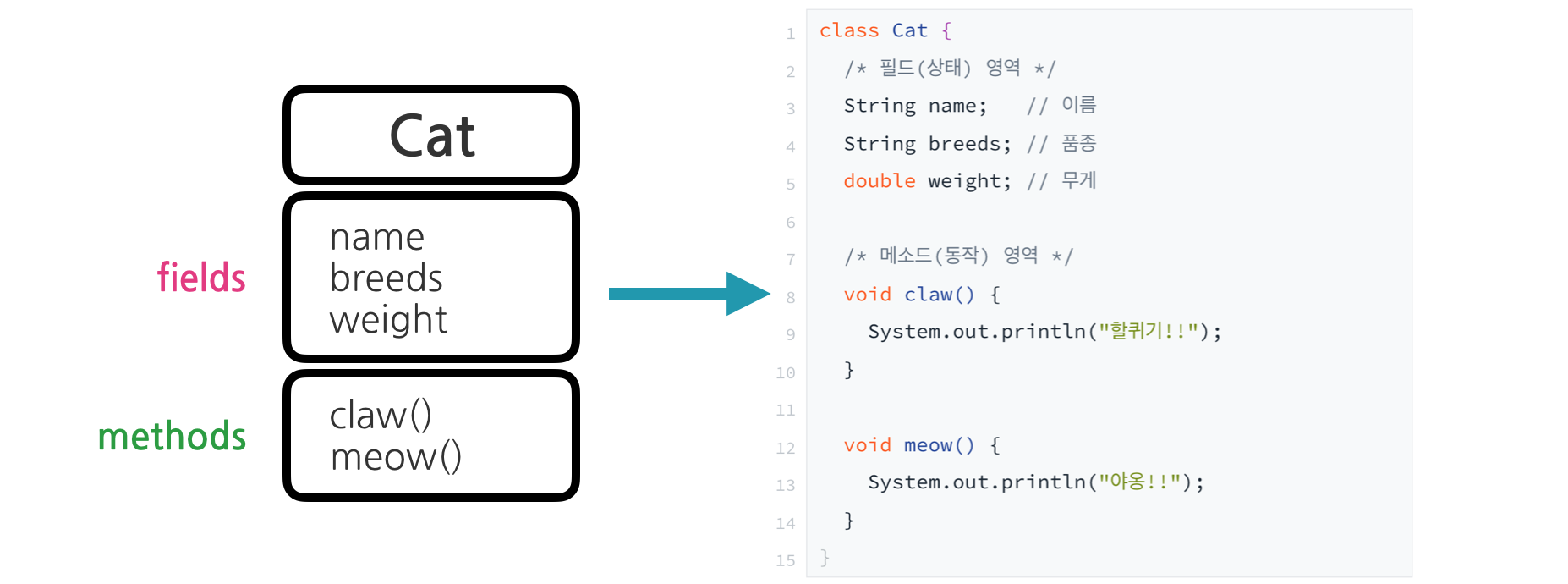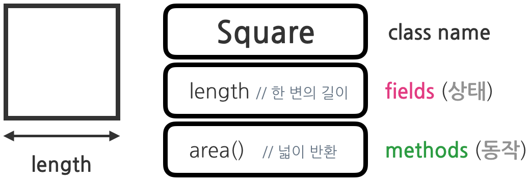 - 클래스는 필드(상태)와 메소드(동작)로 구성된다.