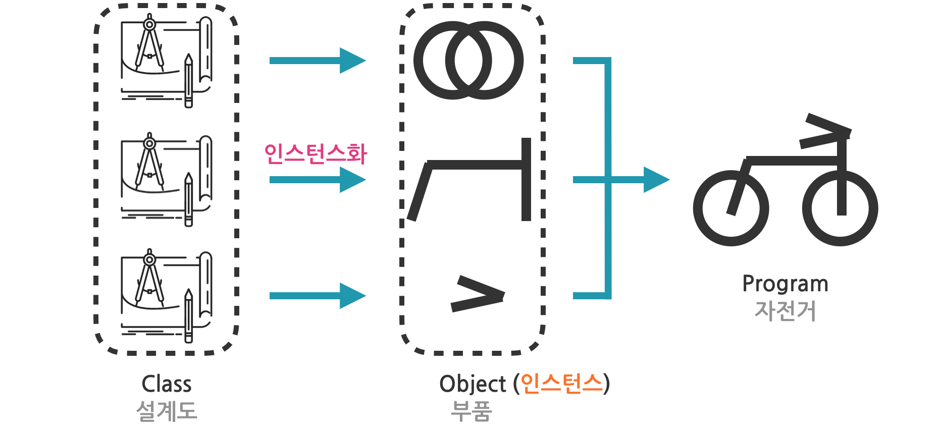 객체지향 프로그래밍(Object-Oriented Programming)이란, 조립식 프로그래밍이다. 객체를 조립하여 전체 프로그램을 만드는 것이다.