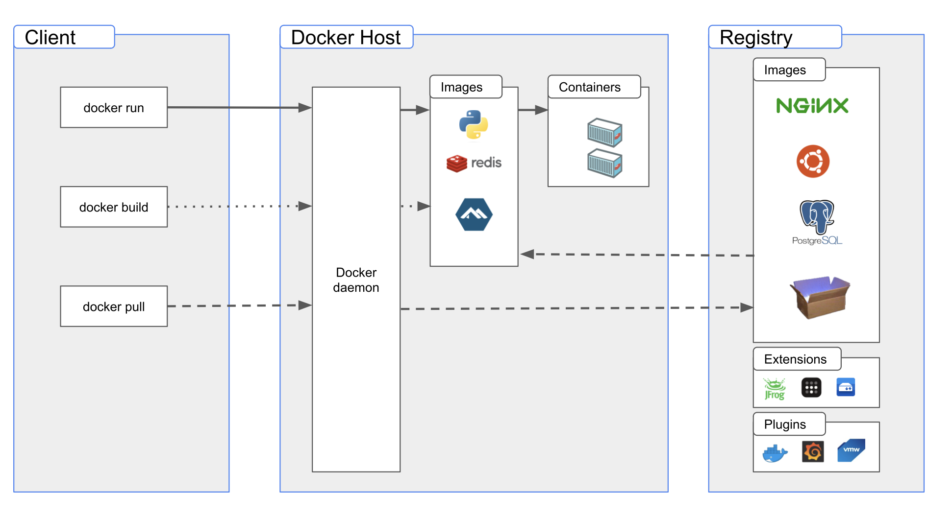 - 도커 클라이언트의 주요 목적은 직접 레지스트리에서 이미지를 받아 호스트에 실행할 수 있게 하는 것