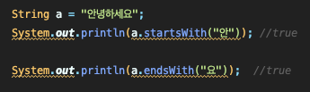 startsWith() , endsWith() 함수를 사용하면 대상 문자열이 특정 문자 또는 문자열로 시작하거나 끝나는지에 대해서 확인할수 있다.