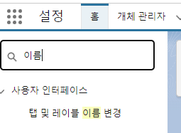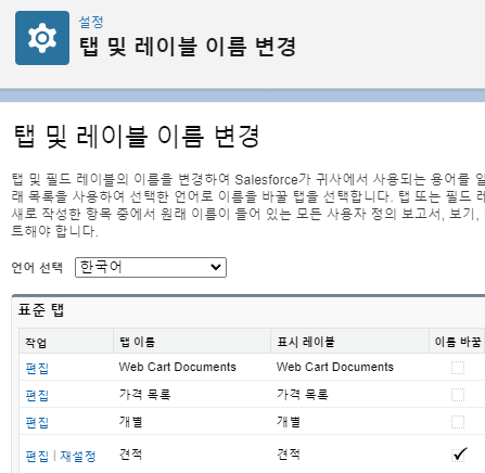 설정(Setup) > 홈 > 사용자 인터페이스 > 탭 및 레이블 이름 변경으로 들어간다