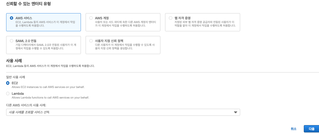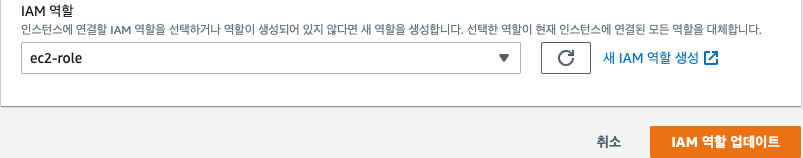 인스턴스에서 오른쪽 버튼 클릭 후 보안 - IAM 역할 수정 만들어둔 ec2용 역할을 선택한 후 저장