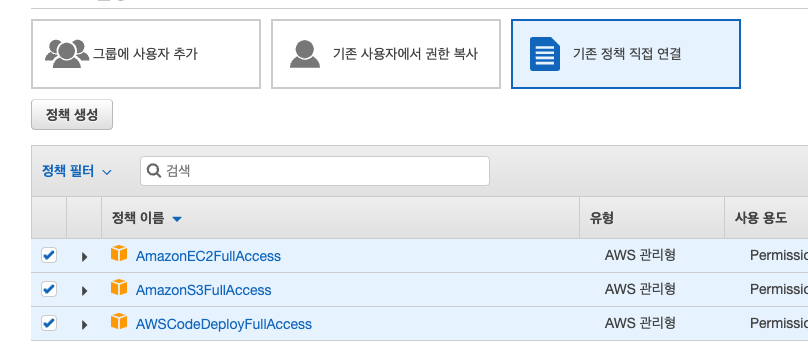 사용자 이름을 입력하고 기존정책 직접 연결에서 검색을 통해 위 3가지