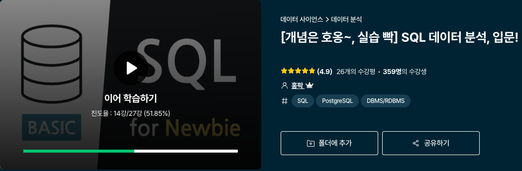 집계함수랑, 필터링까지 빨리 끝내고 PostgreSQL 에 대해서도 한번 정리해야겠다.